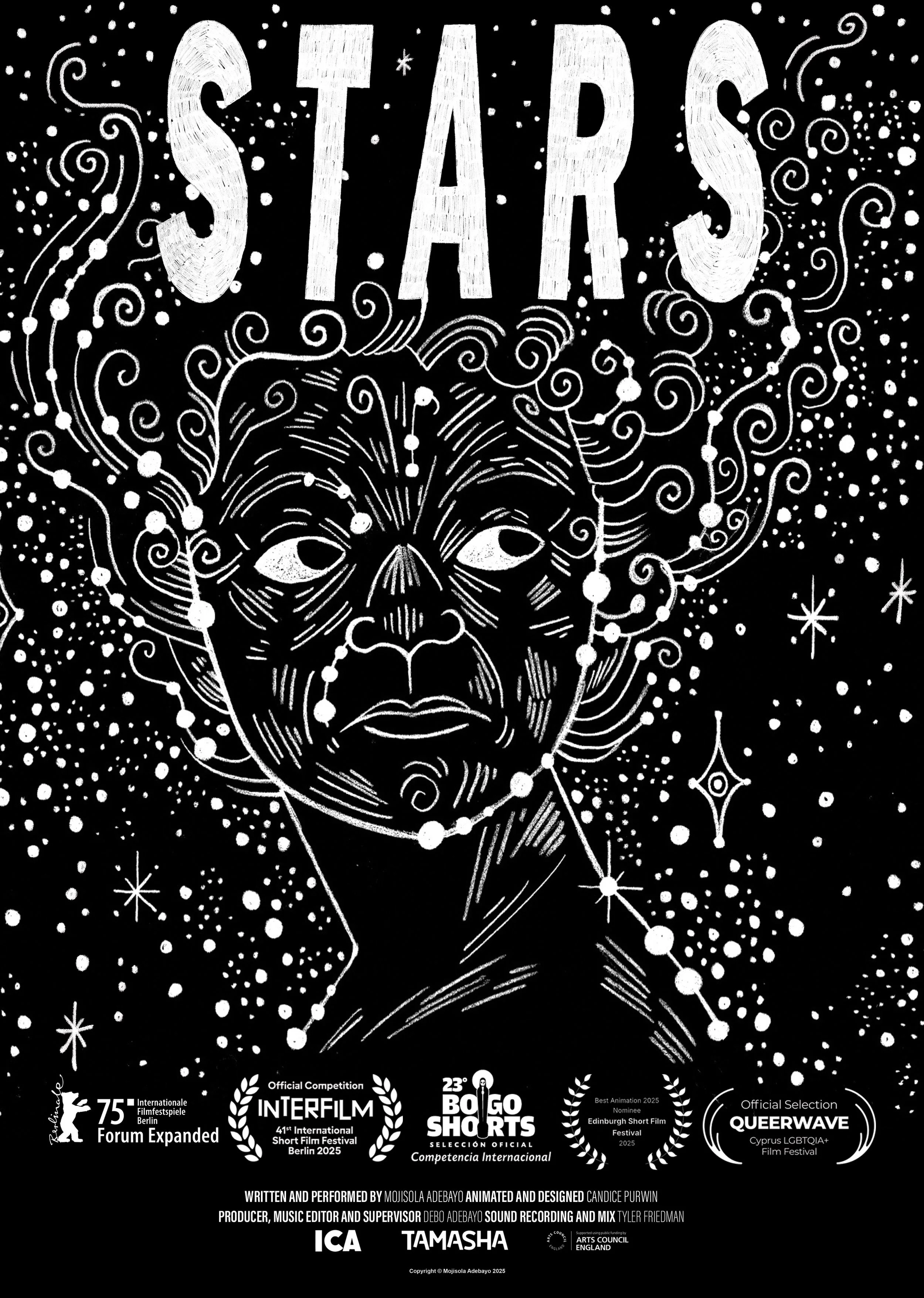 ‘An Afrofuturist Space Odyssey’ and a ‘concept album on stage’ STARS became a production like no other. The animation soon outgrew it’s frantic hand-drawn roots but some of the original sequences from that moment, pencil drawn and then inverted into white on black, survived into the final film. Finally though, I used a wacom to drawn the frames and the ‘mirror’ function in photoshop to speed up the process.