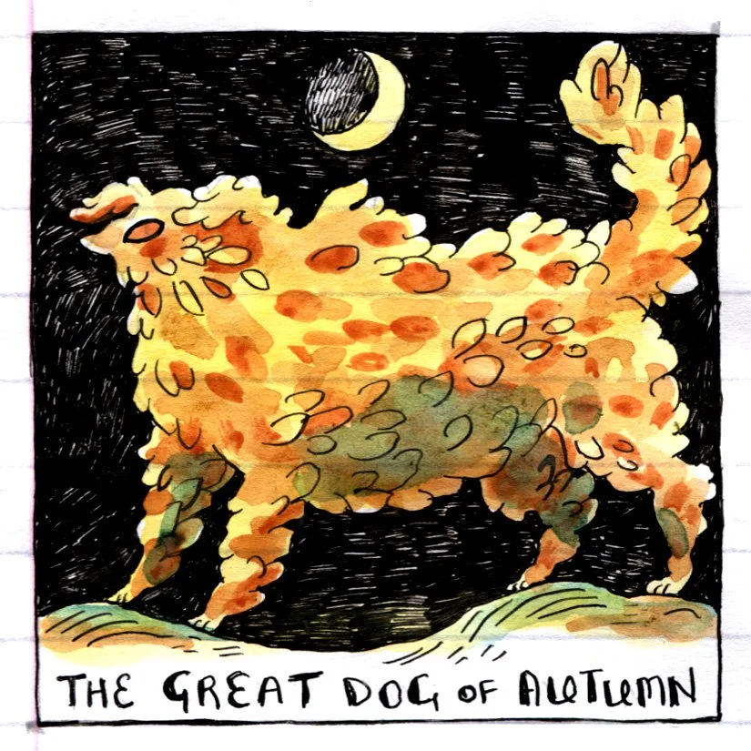 The Great Dog of Autumn will go with you as far as they can. Their coat is soft and brittle. It rustles when they walk. It catches the sun as if it could be kept.