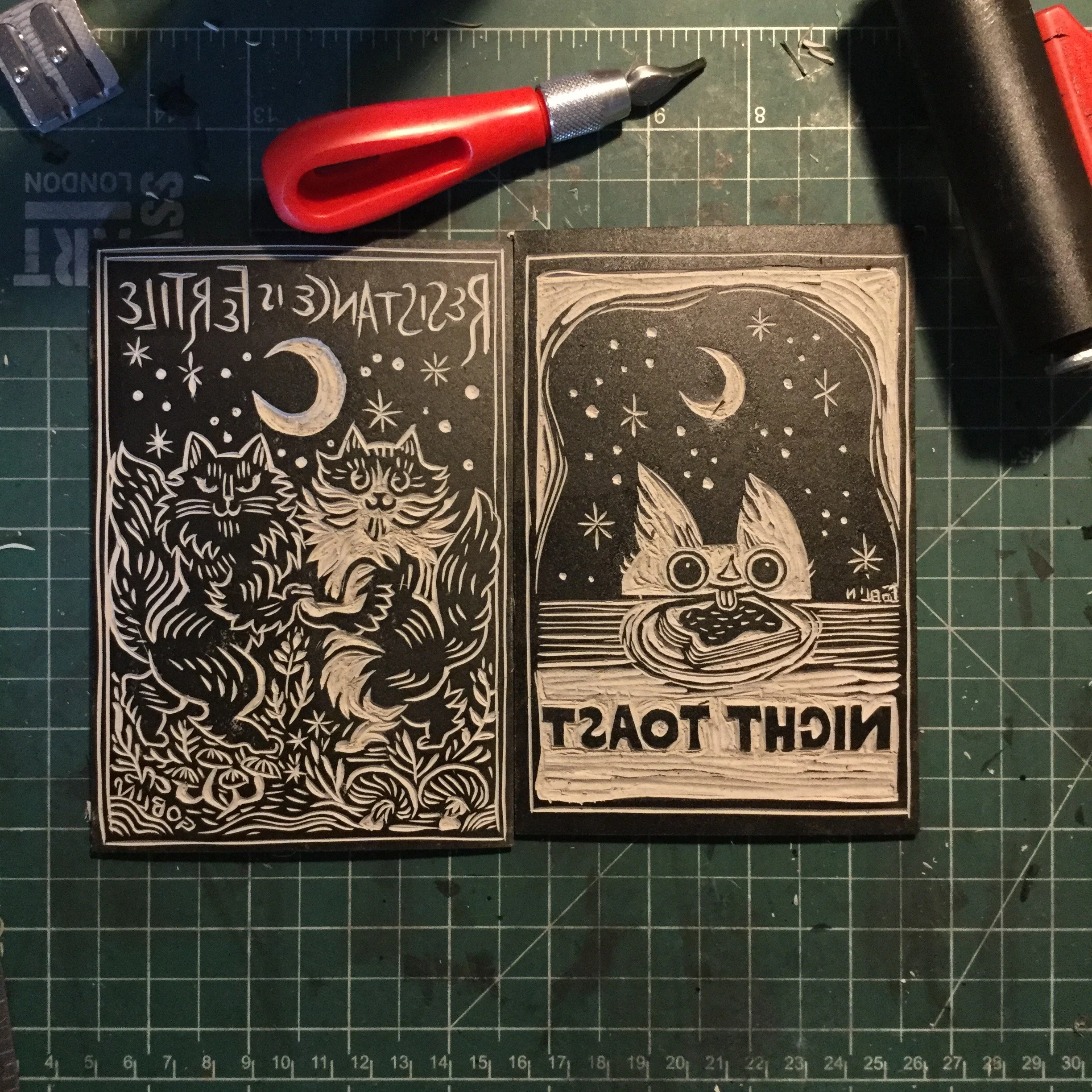 I wanted to make something more immediate as well. As the weather has fought and squalled with it’s own elements these last few days, I’ve traced, drawn and cut lino into fun shapes