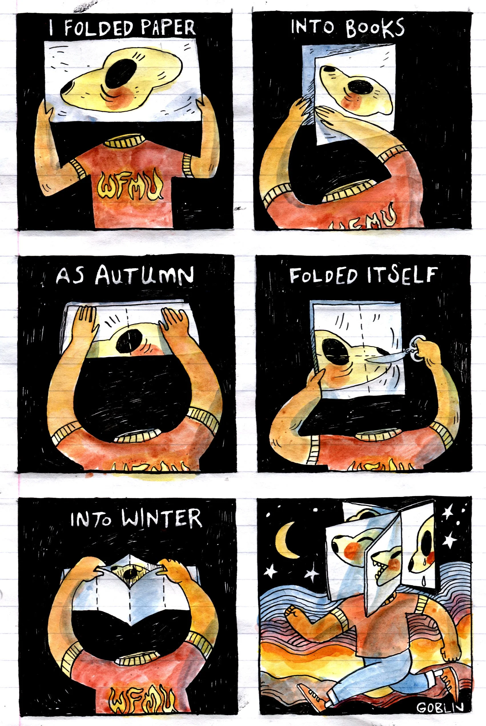 I have a red work book which has become a place to make scrappy, angry or simply observational comics as the month progresses. I can usually measure how busy I’ve been by seeing how many of these I’ve had time to make. They are notes, records, snapshots from the month as it flies past me. Previously I’ve posted them on BlueSky and forgotten about them, but I wanted to start keeping them here as well. Collected as part of the Goblin Comic Library.