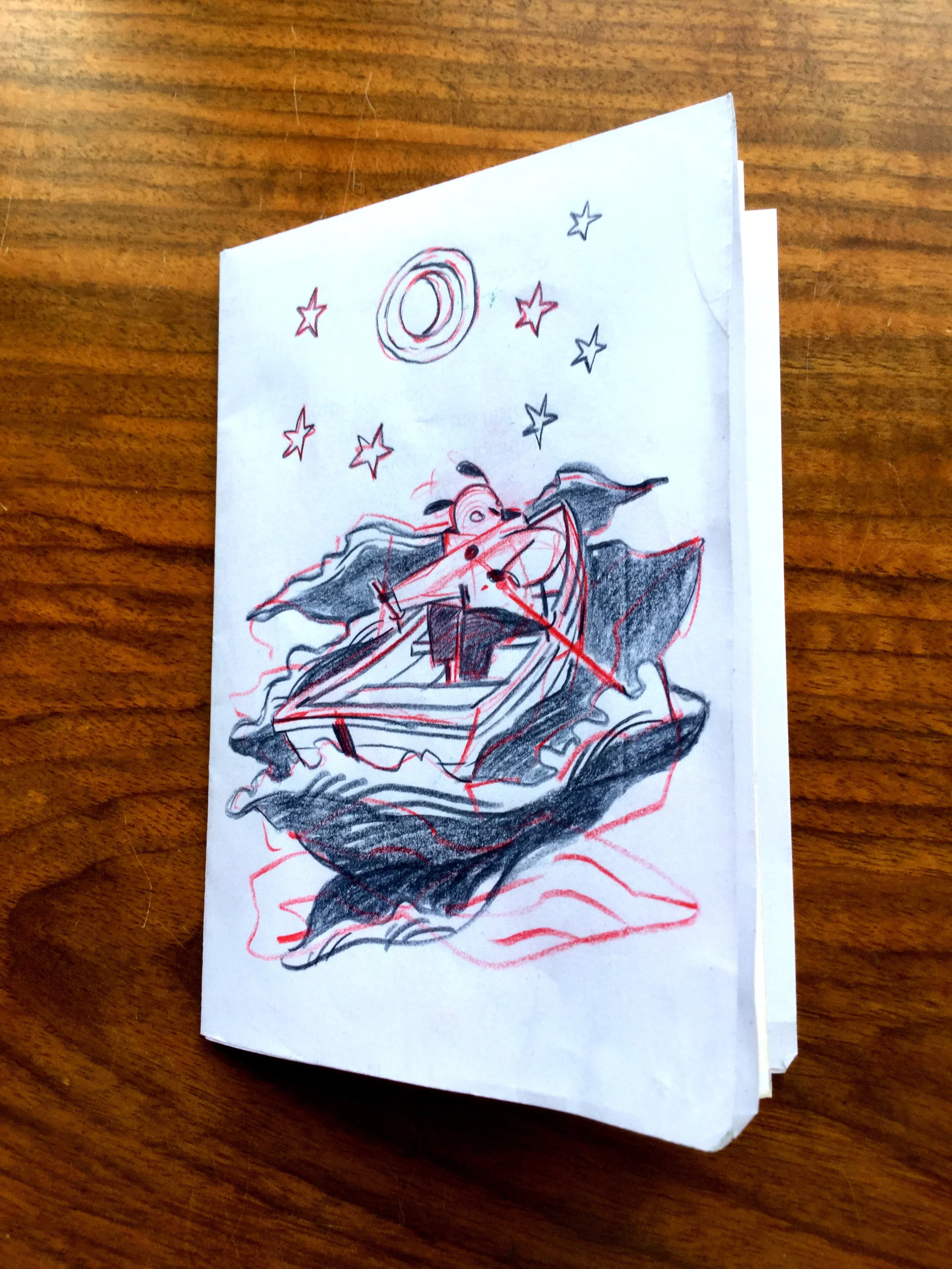 On Sunday morning, knowing I didn’t want to go to throw myself at the feet of the Riso Machine with nothing to offer, I wrote this in the back of my Angry Cat Notebook (which also contains some French and some lists and this page is torn in half for a reason I don’t remember).