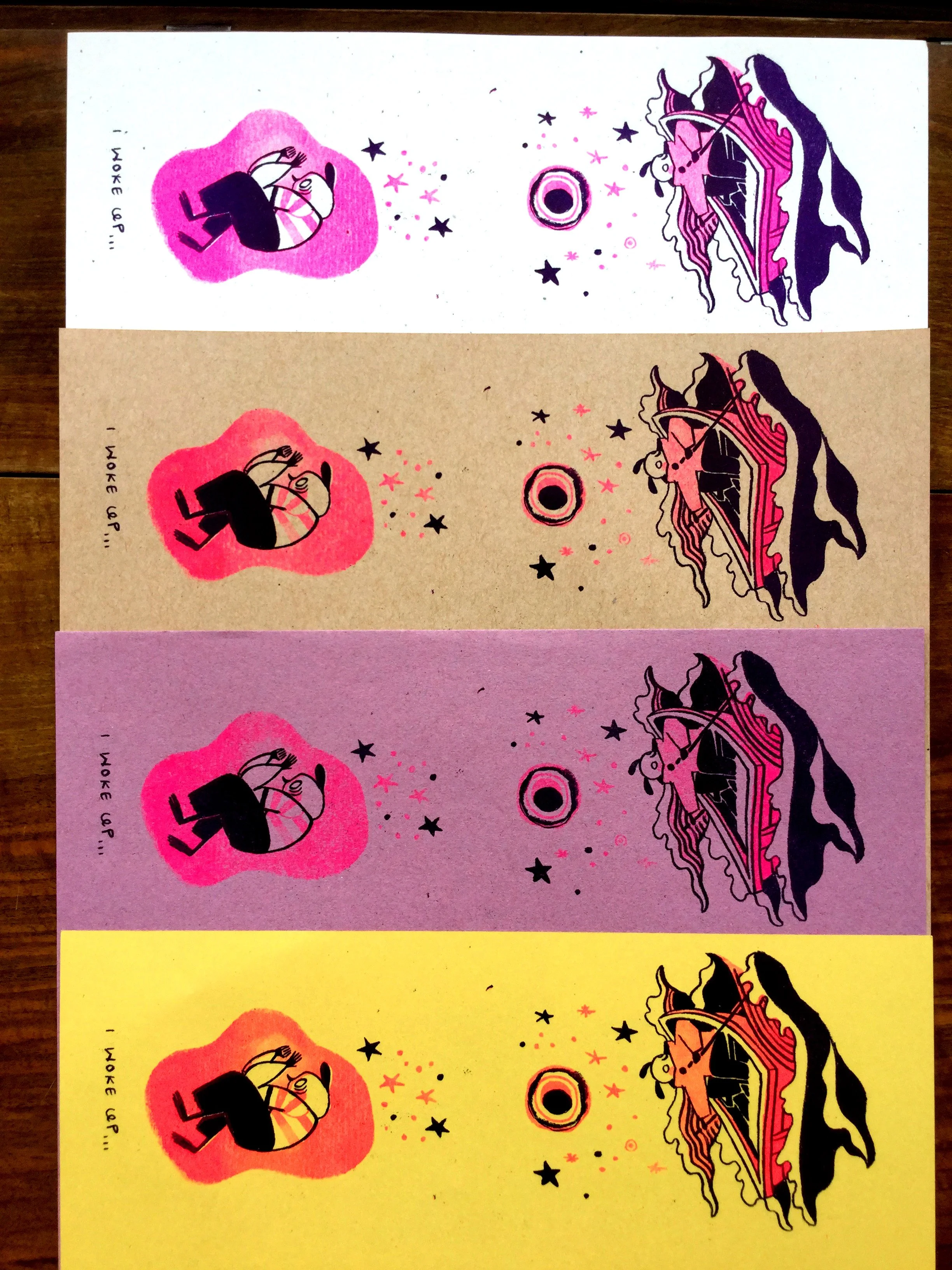 You get to print 20 zines. You’re allowed to experiment with different papers. The paper is almost like another ink changing the mood of everything laid upon it.